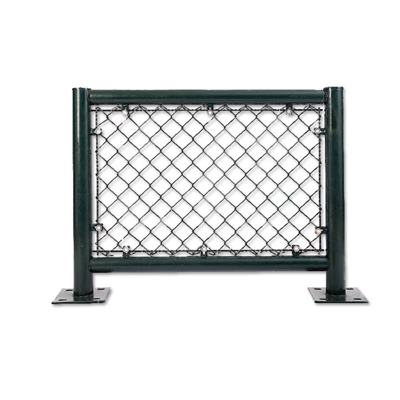 口字型是球场围网的基础主流款,区别于日字型的三根横梁,它仅在立柱间设置上下两根横梁,形成标准 “口” 字框架;立柱与双横梁用直通扣件 + 高强螺栓连接,全程免焊接,现场模块化拼装;网面普遍采用低碳钢丝包塑勾花网整体张拉固定;常见立柱间距 3m,多用于 3 米及以下高度,基础可选预埋或法兰盘固定。